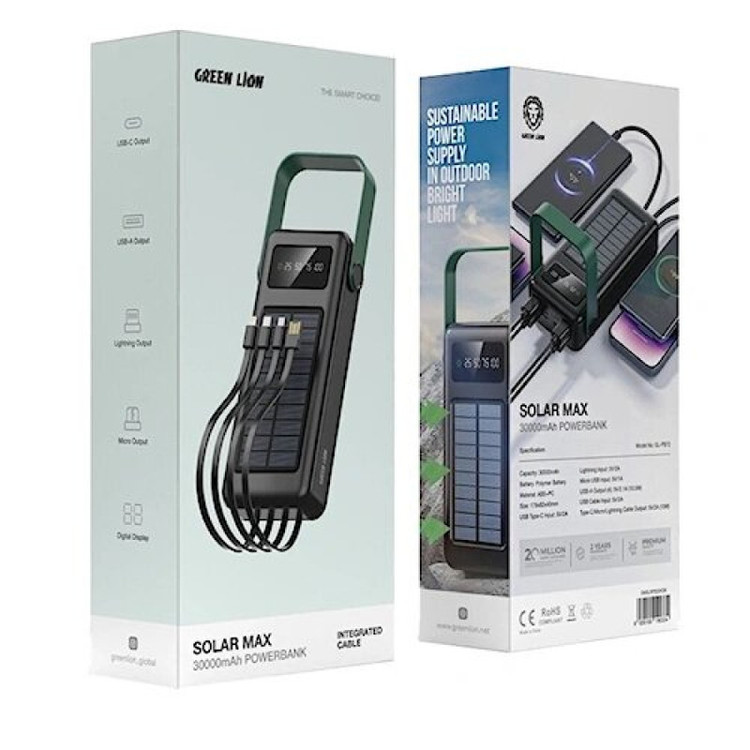 پاوربانک 30000 خورشیدی گرین مدل Solar max یک پاوربانک همه چیز تمام با پنل شارژ خورشیدی میباشد که بدون نیاز به دسترسی به برق شهری ، تنها با قرار گرفتن در معرض نور خورشید ، باتری آن شارژ میشود . این پاوربانک برای کسانی که دائما در حال سفر ، گشت و گذار ، طبیعت گردی ، کمپینگ و … هستند بسیار مناسب است .اولین ویژگی که نظر هر کاربری را جلب میکند ، بی نیازی به حمل کابلهای اضافه میباشد ، زیرا این پاوربانک دارای 4 کابل کوتاه USB-A ، Type-C ، Micro و Lightning است که متصل به پاوربانک میباشد و هر نوع موبایلی را میتوانید شارژ کنید .علاوه بر کابل ، دارای 4 عدد پورت USB-A ، یک عدد پورت Type-C ، یک عدد پورت Micro و یک پورت Lightning برای شارژ موبایل میباشد که از طریق یکی از این پورتها میتوانید پاوربانک را نیز شارژ کنید .در یک طرف آن پنل خورشیدی و در طرف دیگر آن یک پنل نوری LED قرار دارد که در هنگام شب بسیار کاربردی است و نمایشگر دیجیتال آن میزان شارژ باتری را نمایش میدهد .پاوربانک 30000 خورشیدی گرین مدل Solar Portable از قابلیت شارژ سریع نیز پشتیبانی میکند .