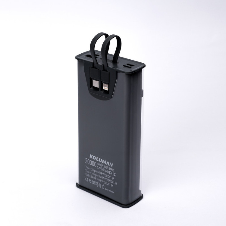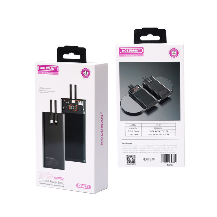 پاوربانک KP-027 تولید شرکت کلومن از یک باتری لیتیومی با ظرفیت 20000 میلیآمپر ساعت بهره میبرد. این پاوربانک 400 گرم وزن دارد . با داشتن این پاوربانک دیگر بابت تمامشدن شارژ باتری گوشی موبایل، تبلت، دوربین دیجیتال و لوازمی از این قبیل نگرانی نخواهید داشت؛ زیرا میتوانید در هر شرایطی بدون نیاز به پریز برق، باتری گوشی موبایل یا دیگر لوازم سازگار با این محصول راحتی بدون همراه داشتن کابل شارژ کنید. در ساخت این دستگاه از تکنولوژی شارژ سریع Quick Charge 3.0 استفاده شده است. پشتیبانی از شارژ سریع به این معنی است که باتری دستگاه شما با کمک این پاوربانک سریعتر از شارژرهای معمولی شارژ خواهد شد. البته باید توجه داشته باشید که تکنولوژی شارژ سریع تنها با دستگاههای دارای استاندارد شارژ سریع سازگار است و در دستگاههای معمولی امکان استفاده از این تکنولوژی وجود ندارد. شدت جریان خروجی در این شارژر همراه با توجه به ولتاژ خروجی آن، متفاوت است. زمانی که ولتاژ خروجی در این محصول 4.5 تا 5 ولت باشد، شدت جریان خروجی 3 تا 5 آمپر است. این در حالی است که اگر ولتاژ خروجی در این محصول 6 تا 9 ولت باشد، شدت جریان خروجی برابر با 2 آمپر خواهد بود. در حالت سوم و زمانی که ولتاژ خروجی 9 تا 12 ولت باشد، شدت جریان خروجی برابر با 1.5 آمپر است. در مورد شدت جریان ورودی این محصول نیز باید بدانید که اگر در حالت عادی ولتاژ ورودی در آن 5 ولت باشد، شدت جریان ورودی2 آمپر خواهد بود و در حالت شارژ سریع (5V ⎓3A) است. شما میتوانید وضعیت شارژ باتری KP-027 را از طریق صفحه نمایشگر LED روی بدنه بررسی کنید..توان کلی این دستگاه تا 22.5 وات میباشد و این دستگاه مجهز به فناوری PD با توان 20 وات نیز است. که یکی از قابلیت های بسیار مهم آن تلقی میشود زیرا شما هم میتوانید با این درگاه پاوربانک را شارژ کنید و هم به عنوان خروجی از آن استفاده کنید و دستگاه خود را با آن شارژ کنید. این پاوربانک دارای 4 خروجی است که دو عدد از این خروجی ها دارای کابل است. یکی از کابل های متصل به این دستگاه تایپ سی و دیگری لایتنینگ است که شما میتوانید به طور مستقیم گوشی خود را به این کابل ها وصل کنید .