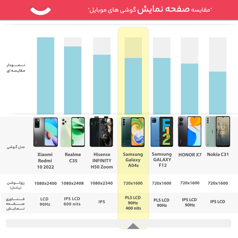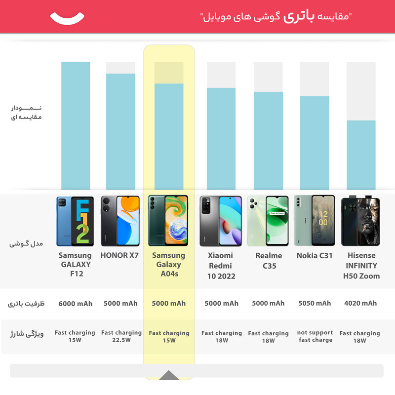 بدون شک گوشیهای هوشمند سری A سامسونگ در بین رقبا توانستهاند عملکرد بسیار خوبی را بهنمایش بگذارند. یکی از این گوشیهای باکیفیت و البته مقرون بهصرفه، سامسونگ Galaxy A04s است. طراحی در نظر گرفته شده برای این گوشی، طراحی آشنایی است که پیش از این هم سامسونگ از آن در گوشیهای هوشمند خود استفاده کرده بود که البته بسیار کاربر پسند است. در نمای روبهرویی این گوشی به صفحهنمایش با ابعاد 6.5 اینچ و رزولوشن 720×1600 پیکسل از نوع PLS مجهز شده است. صفحهنمایشی که از قابلیتهای آن میتوانیم به نرخ بروزرسانی 90 هرتز و حداکثر روشنایی 400 نیت (شمع در متر مربع) اشاره کنیم. بریدگی قطرهای شکل ناچ در قسمت بالایی و مرکزی صفحهنمایش سنسور دوربین سلفی با رزولوشن 5 مگاپیکسل را در خود جای داده که برای ثبت تصاویر در نور روز مناسب است و البته برای تماسهای تصویری هم عملکرد کاملا قابل قبولی دارد. در قسمت پشتی این گوشی سه سنسور دوربین در نظر گرفته شده است. سنسور دوربین اصلی با رزولوشن 50 مگاپیکسل که باید بگوییم برای چنین گوشی مقرون بهصرفهای سنسور قدرتمندی به حساب میآید در کنار دو سنسور 2 مگاپیکسل از نوع سنجش عمق و ماکرو، سنسورهای دوربین سهگانه سامسونگ Galaxy A04s را تشکیل میدهند. پردازنده اگزینوس 850 اختصاصی سامسونگ هم برای اجرای بازیهای محبوب و نرمافزارهای کاربردی، عملکرد قابل قبولی دارد. در نهایت هم باتری با میزان ظرفیت 5000 میلیآمپرساعت سبب شده تا سامسونگ Galaxy A04s به ازای هر بار شارژ صد درصدی، طول عمر مفید (زمان آماده بهکار) دو روز را در شرایط استفاده معمولی ارائه کند.