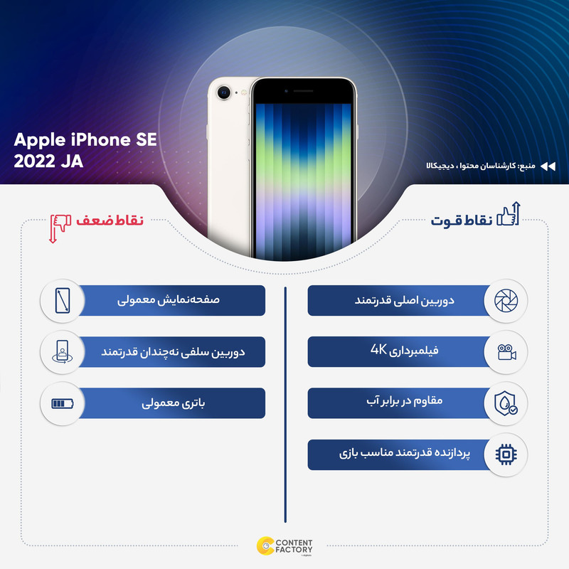 سری SE گوشیهای هوشمند شرکت اپل با بهره بردن از قیمتهای ارزانتری به نسبت پرچمداران این شرکت، طرفداران بسیار زیادی در بین کاربران داشتهاند و توانستهاند فروش بسیار خوبی را در بازار به خود اختصاص دهند. iPhone SE 2022 JA هم به عنوان یکی از گوشیهای مقرون بهصرفه این شرکت معرفی شد و مشخصات قدرتمندی را با خود بههمراه داشت. این گوشی به صفحهنمایش با ابعاد 4.7 اینچ و رزولوشن 750×1334 مجهز شده که توانایی نمایش 326 پیکسل در هر اینچ را دارد. در قسمت پشتی تنها یک سنسور دوربین اصلی با رزولوشن 12 مگاپیکسل را شاهد هستیم که توانایی ضبط ویدیو با حداکثر کیفیت 4K سرعت 60 فریم در ثانیه را هم دارد. دوربین سلفی با رزولوشن 7 مگاپیکسل هم iPhone SE 2022 JA را همراهی میکند. این گوشی هوشمند به یکی از قدرتمندترین پردازندههای اختصاصی اپل یعنی A15 بایونیک مجهز شده است. پردازندهای که بهراحتی از پس بازیهای سنگین برمیآید و عملکرد بسیار خوبی را ارائه میکند. باتری 2018 میلیآمپرساعت به توانایی پشتیبانی از شارژر با توان 20 وات و مجهز به فناوری شارژ سریع از دیگر مشخصات در نظر گرفته شده برای iPhone SE 2022 JA هستند.